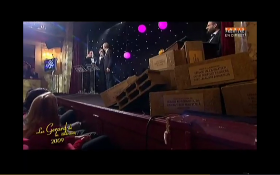 Patrick Sébastien est venu, il a vu, mais il n’est pas reparti avec le précieux parpaing… Patrick était déçu, mais pour la peine, il s’est offert un petit speech sur la scène du théâtre Michel, entouré de Fred Royer, Arnaud Demanche et Stéphane Rose…